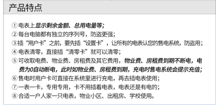 主要特點:應用計算機管理,先購電后用電;在額定電流范圍內能限制使用功率(由供電部門限定);一表一卡,專卡專用,失卡不失電,補卡再用;電卡能雙向傳遞數(shù)據(jù),能自動斷電告警用戶購電;電量為零時,自動拉閘斷電;并具有一定的防竊電軟件設計等。